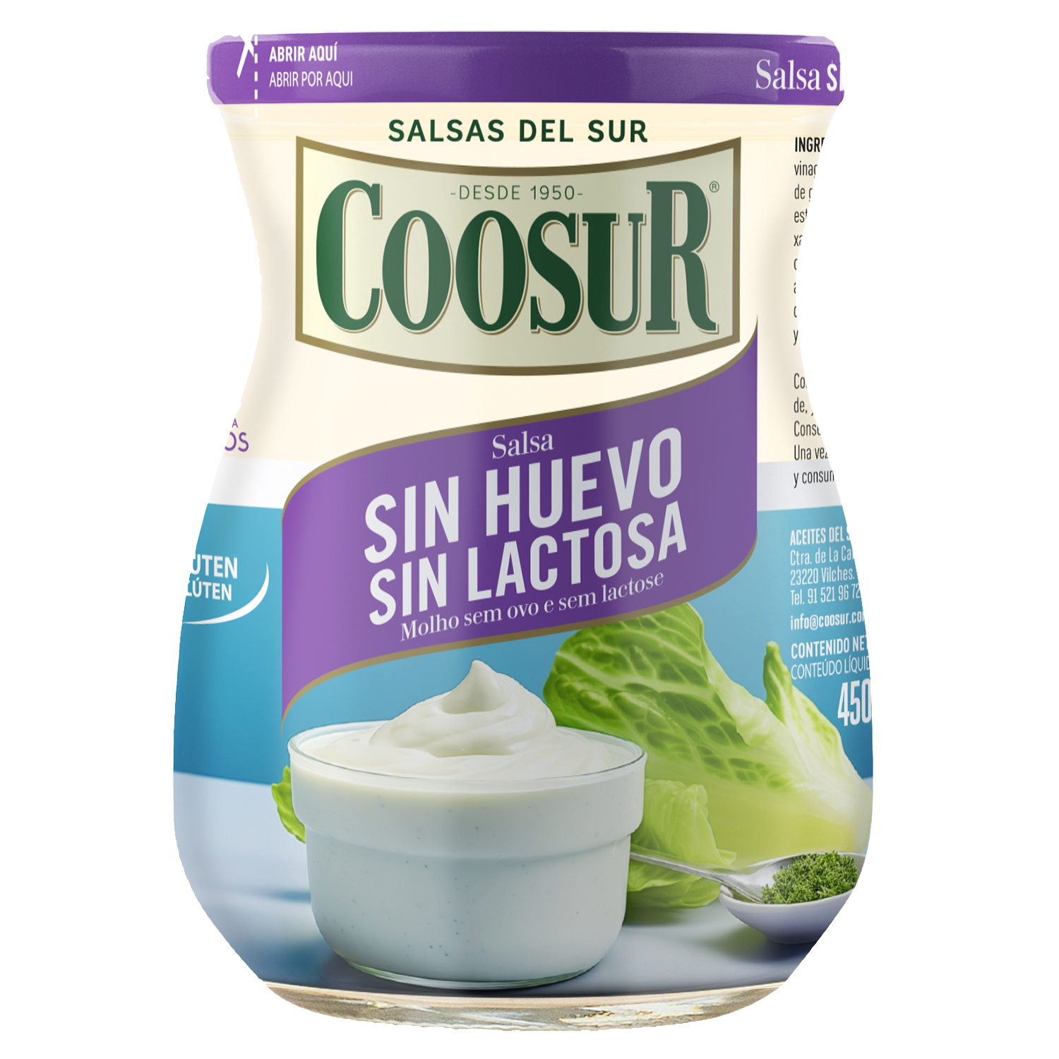 La Salsa Sin Huevo y Sin Lactosa Coosur está elaborada con los mejores ingredientes: Aceite de girasol, agua, vinagre de alcohol, azúcar, sal, proteína de guisante, almidón modificado de maíz, estabilizantes (goma guar y goma xantana), zumo de limón concentrado, conservador (sorbato potásico), antioxidantes (extracto de romero y EDTA de calcio y disodio), colorante (carotenos) y aromas naturales. Cada ingrediente ha sido seleccionado cuidadosamente para crear una salsa deliciosa y segura para todos.